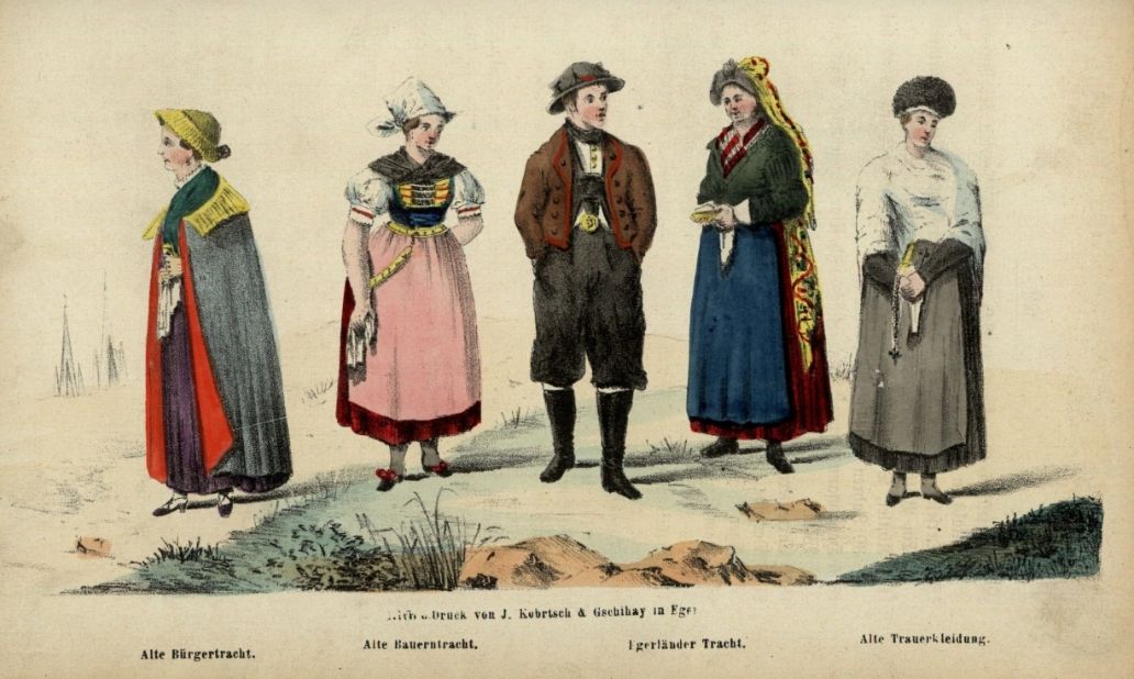 I searched for Cheb (Eger) area traditional costumes (kroj) because of Amy's question in comments under the blog post showing some pictures of these costumes from different regions of Bohemia. I have found quite interesting book published in 1845 and then again in 1877 about Cheb and its surroundings called Eger und das Egerland by Vinzenz Pröckl. There are some pictures of traditional costumes from this area.